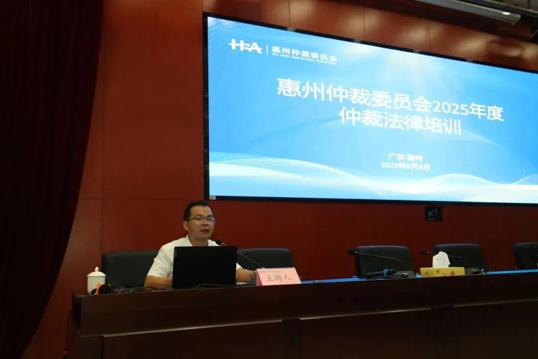 2025年8月8日,由惠州仲裁委员会委托惠州市惠融国际商事调解中心承办的惠州仲裁委员会2025年度仲裁法律培训在惠州仲裁委圆满举办,惠州仲裁委主任曾红艳作了开班致辞,惠州仲裁委副主任龙艳军、第八届惠州仲裁委在聘仲裁员、市内热爱或有志从事仲裁事业的律师及仲裁法律志愿者近200人现场参加。培训采用线上线下同步直播方式,线上参加或浏览人数近3000人次。惠州仲裁委副主任宾亮主持培训。
