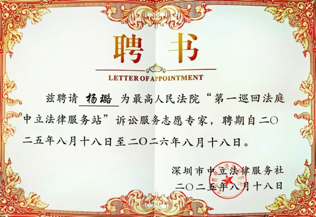 近日,深圳市中立法律服务社正式发布《关于“第一巡回法庭中立法律服务站”诉讼服务志愿专家拟聘任名单的公示》。我中心理事兼执行秘书长杨璐续聘“最高人民法院第一巡回法庭中立法律服务站诉讼服务志愿专家”,任期1年(2025年8月18日—2026年8月18日)。