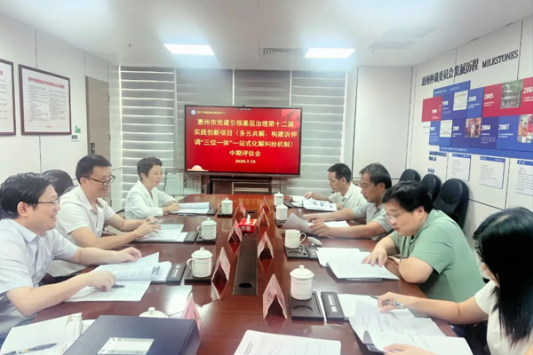 7月15日下午,惠州市党建引领基层治理第十二届实践创新项目中期评估组一行,莅临惠州市惠融国际商事调解中心(以下简称“惠融调解中心”),对惠融调解中心于去年十二月荣获该项目三等奖的“多元共解:构建诉仲调‘三位一体’一站式化解纠纷机制”项目开展中期评估工作。此次评估由惠州市委社会工作部基层治理和基层政权建设科郑宇科长、惠州学院政法学院周巍副院长作为带队领导,评估过程中,工作组围绕项目进展情况、目标完成