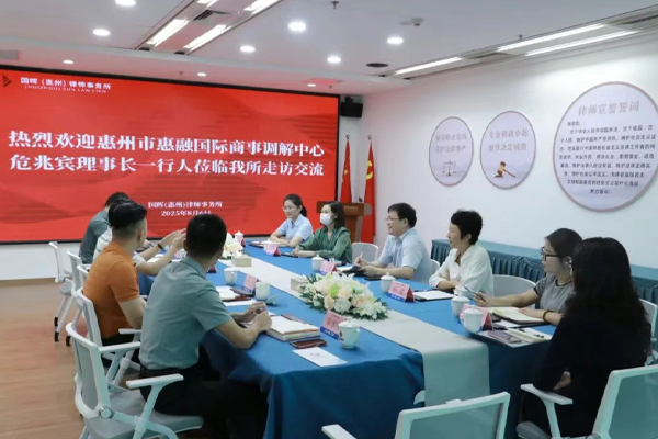 2025年8月6日上午,惠州市惠融国际商事调解中心(以下简称“我中心”)理事长危兆宾、理事兼执行秘书长杨璐,以及中共惠州华贸楼宇党委副书记卢文君一行,前往广东国晖律师事务所(以下简称“国晖所”)走访交流。国晖所党支部书记、高级合伙人王永平,执行主任黄丽珠,合伙人王治平,律师何远龙及实习律师薛官带对来访一行表示热烈欢迎,双方围绕多领域合作开展深入座谈。座谈中,何远龙律师首先通过宣传视频介绍了国晖所的